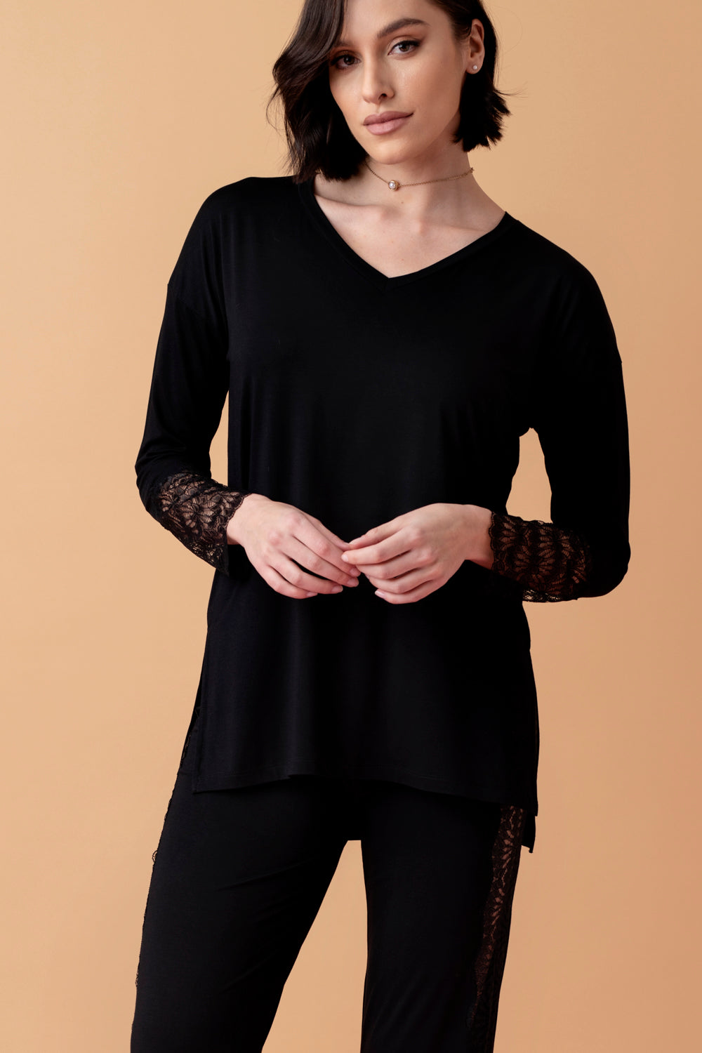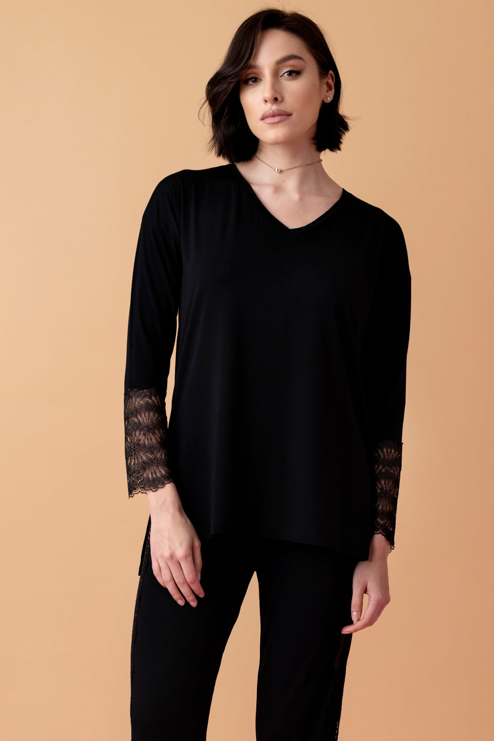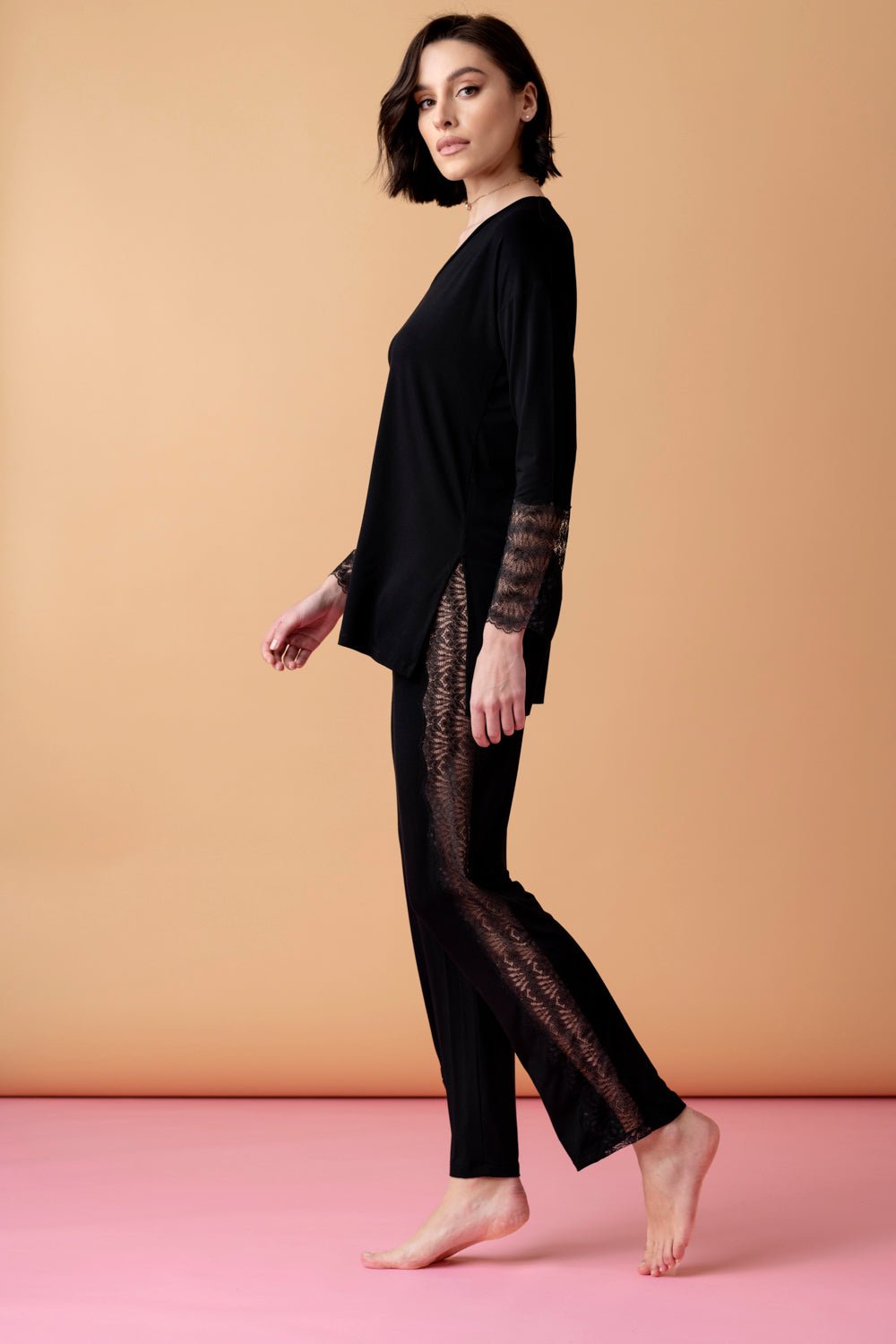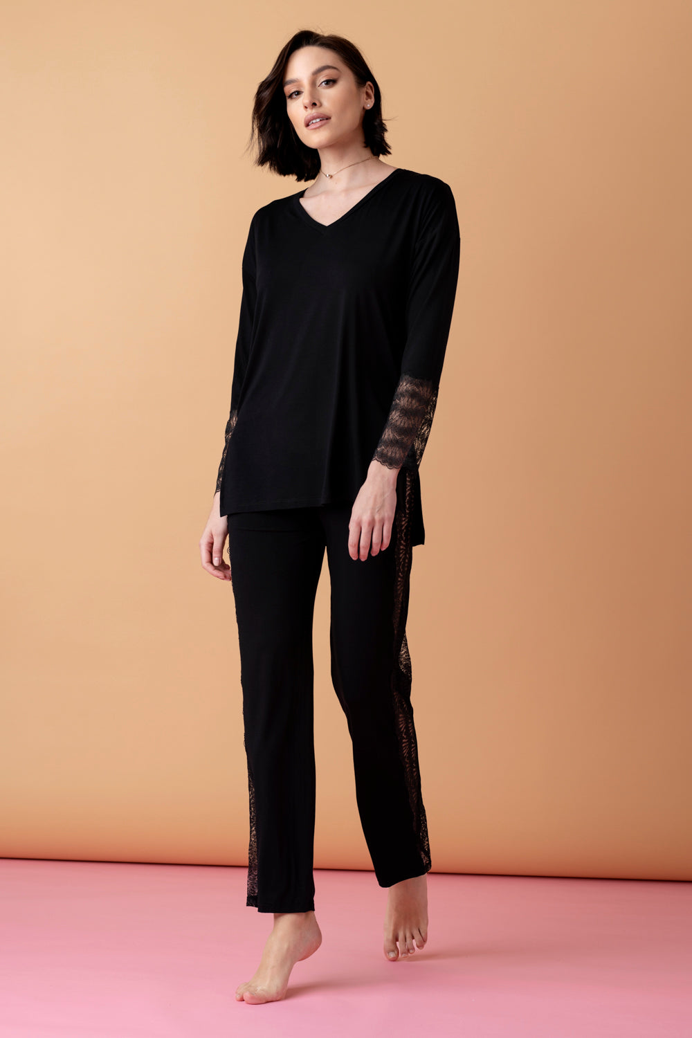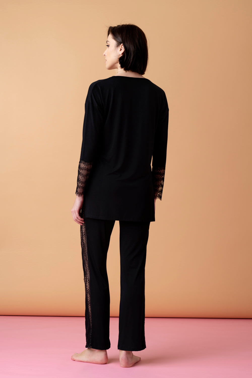 Poem – Langes Pyjama-Set mit seitlichen Spitzenstreifen – Schwarz