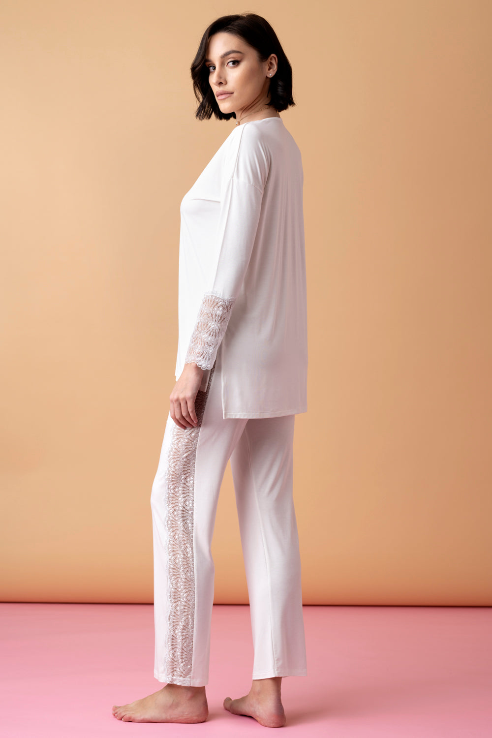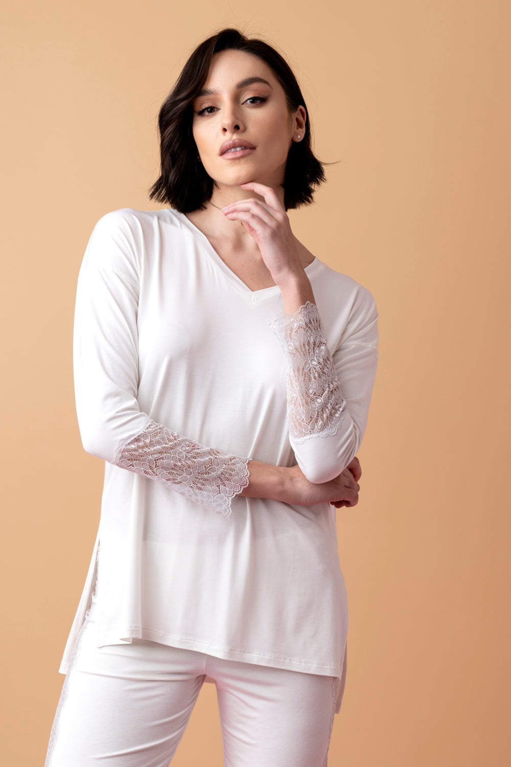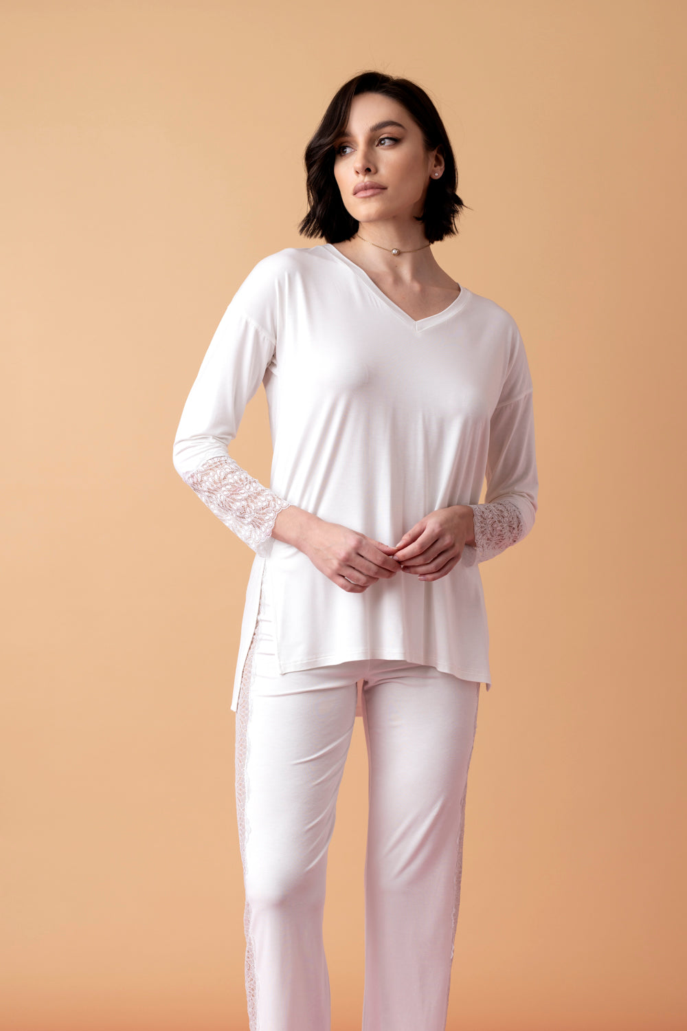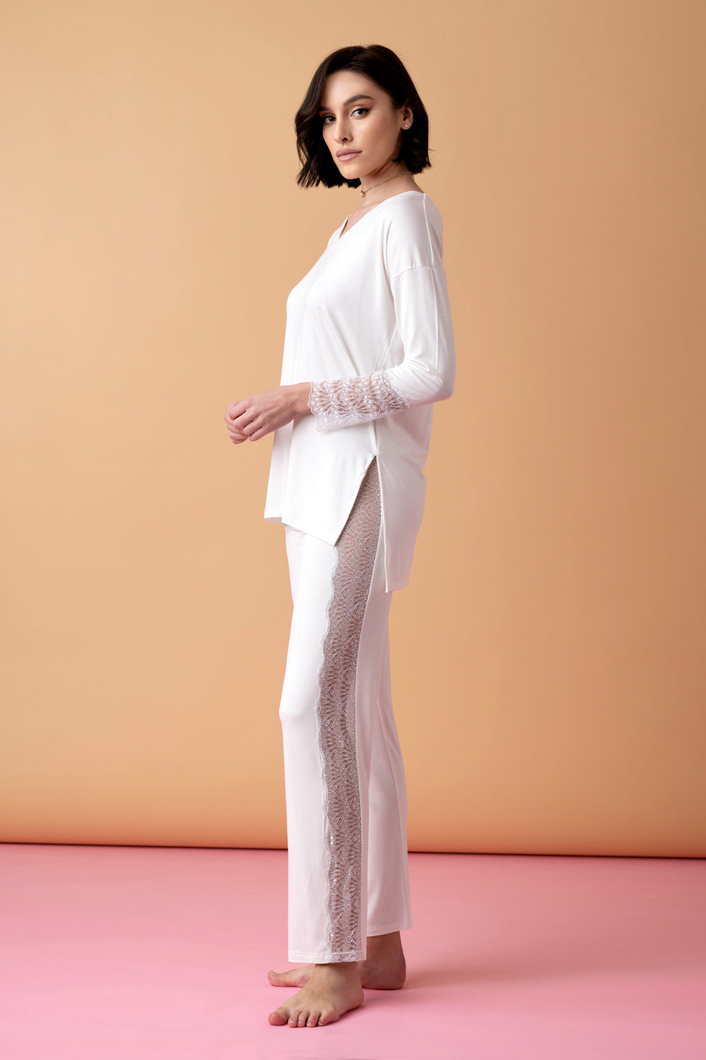 Die locker sitzende Bluse mit V-Ausschnitt und leicht verlängertem Rückenteil sorgt für einen entspannten Look, während die Spitzenmanschetten für einen besonderen Touch sorgen. Die gerade geschnittene Hose ist mit halbtransparenten Spitzenstreifen verziert – ein Touch, der dem Alltag Leichtigkeit und Poesie verleiht. Der elastische Bund garantiert Tragekomfort, egal ob beim Lesen am Abend oder beim Zubettgehen.