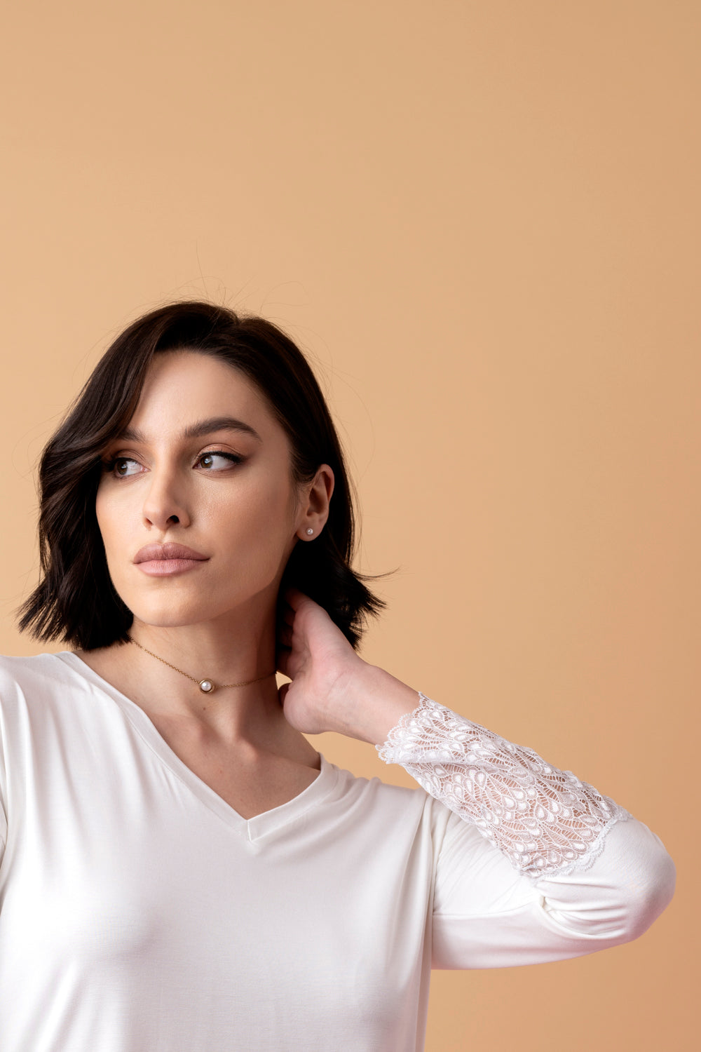 Manchmal genügt schon ein Set, um einen Abend in ein kleines Ritual der Ruhe zu verwandeln. Der cremefarbene Pyjama aus der Linie Poem wurde genau für solche Momente kreiert – weich , körperbetont, mit Details, die den Schlaf mit einem Lächeln beginnen lassen.