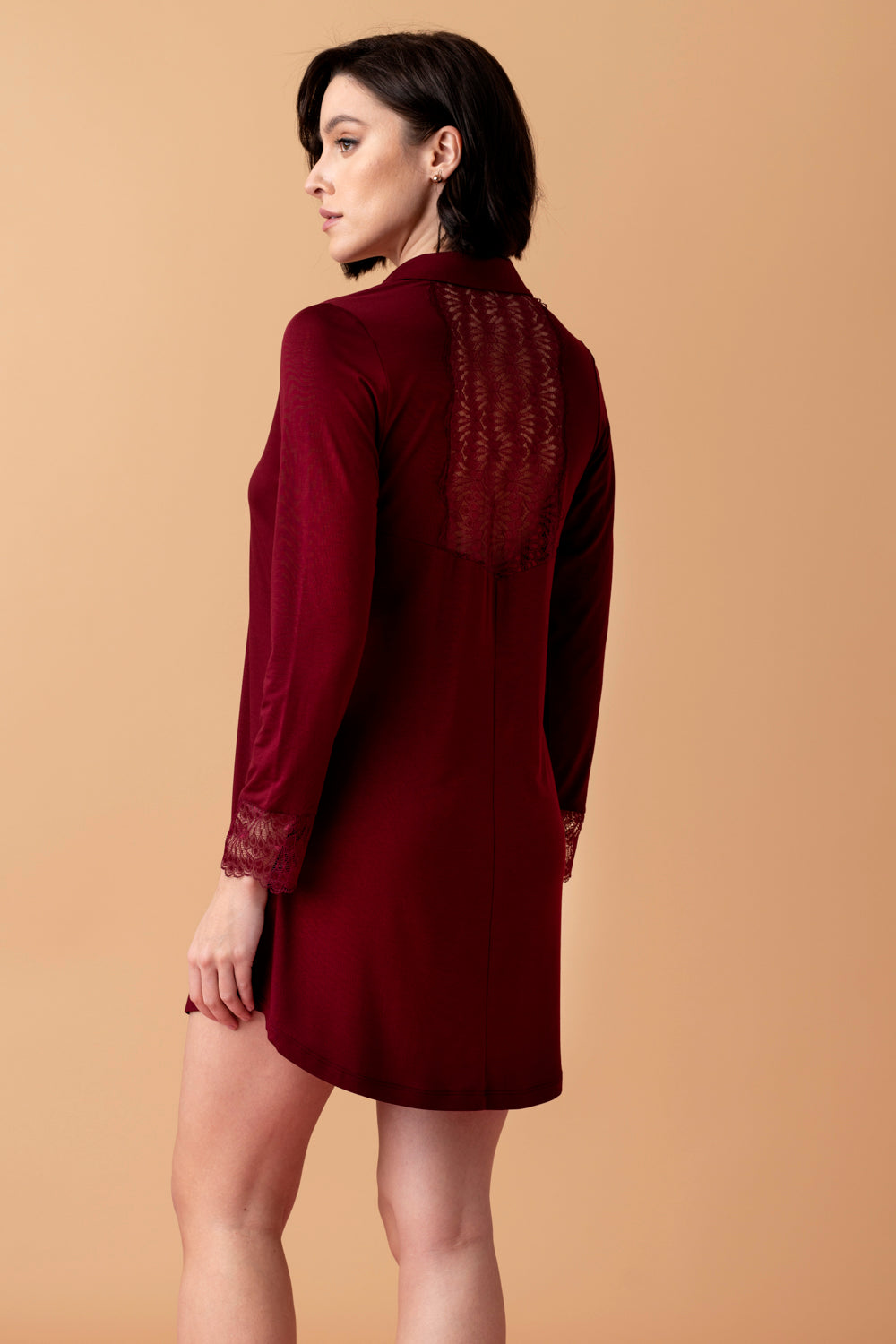 Dieses weinrote Nachthemd ist perfekt für Momente, in denen Sie Ihre Weiblichkeit dezent betonen möchten. Der klassische Kragen und der Knopfverschluss werden durch Spitzenmanschetten und einen zarten, halbtransparenten Einsatz am Rücken aufgelockert. Diese subtilen Details verwandeln eine schlichte Form in etwas wirklich Einzigartiges.