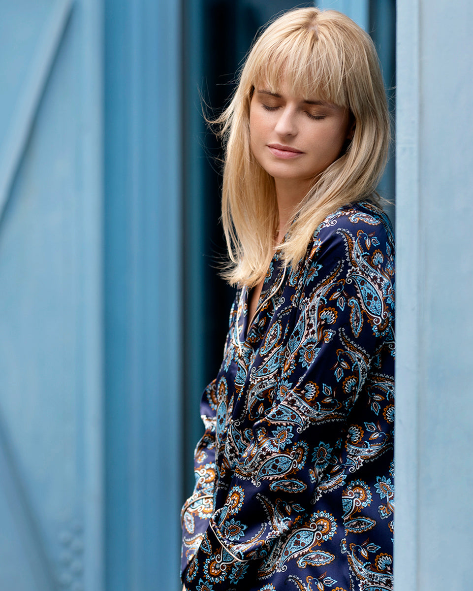Oh!Zuza Lullaby Long Silk Pajamas – Deep Navy, Paisley Pattern