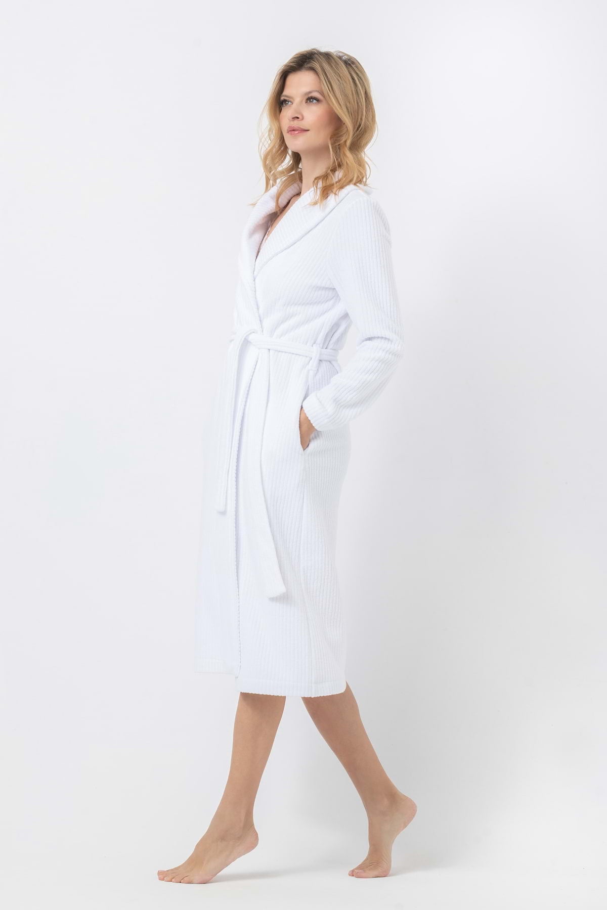 Among the cotton models , the Calma white ribbed bathrobe with a turn-down collar is worth mentioning. It impresses not only with its practicality but also with its aesthetics. Its modern cut and meticulous finish are hallmarks of Oh!Zuza quality.