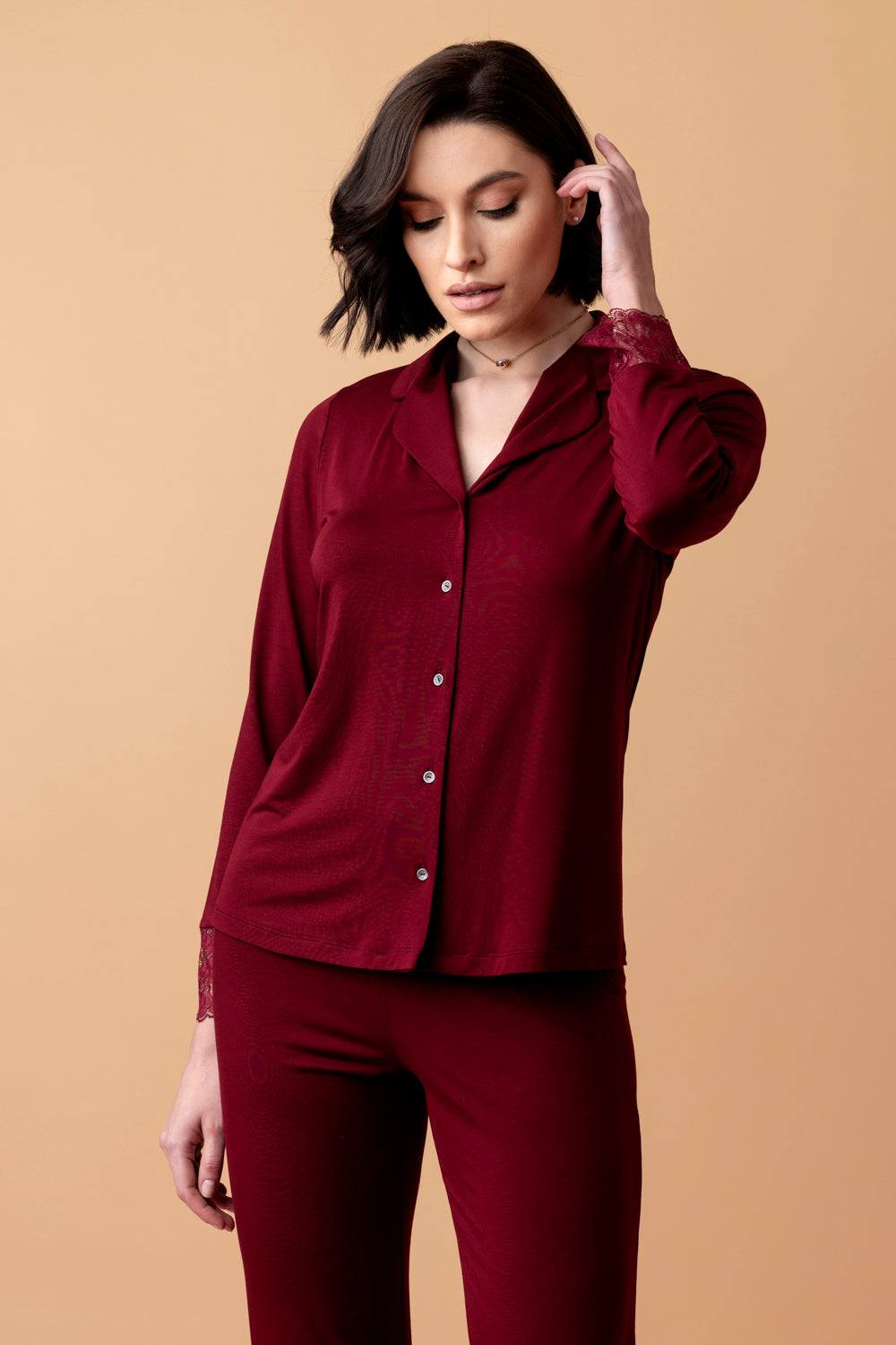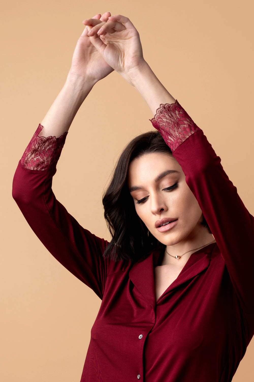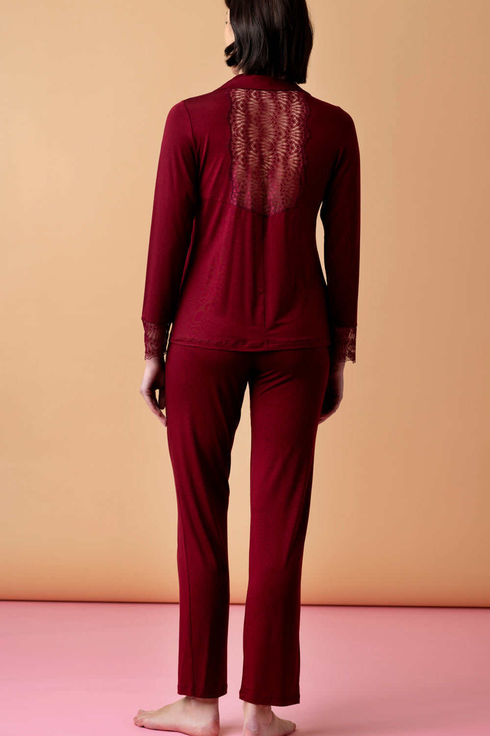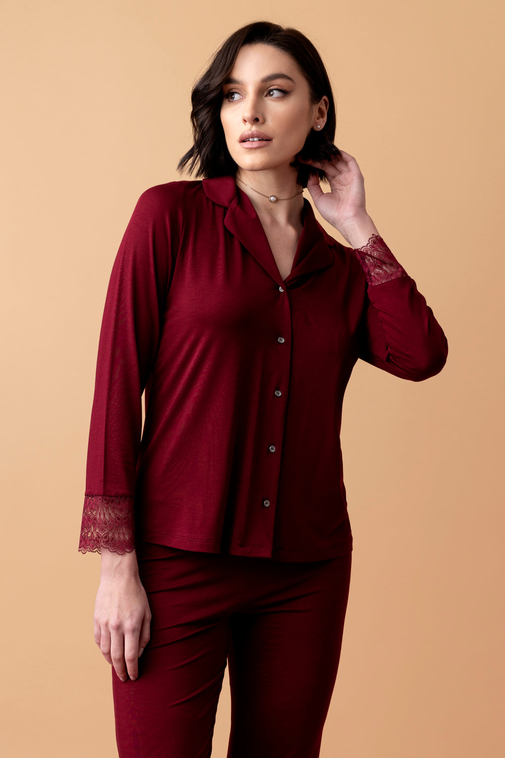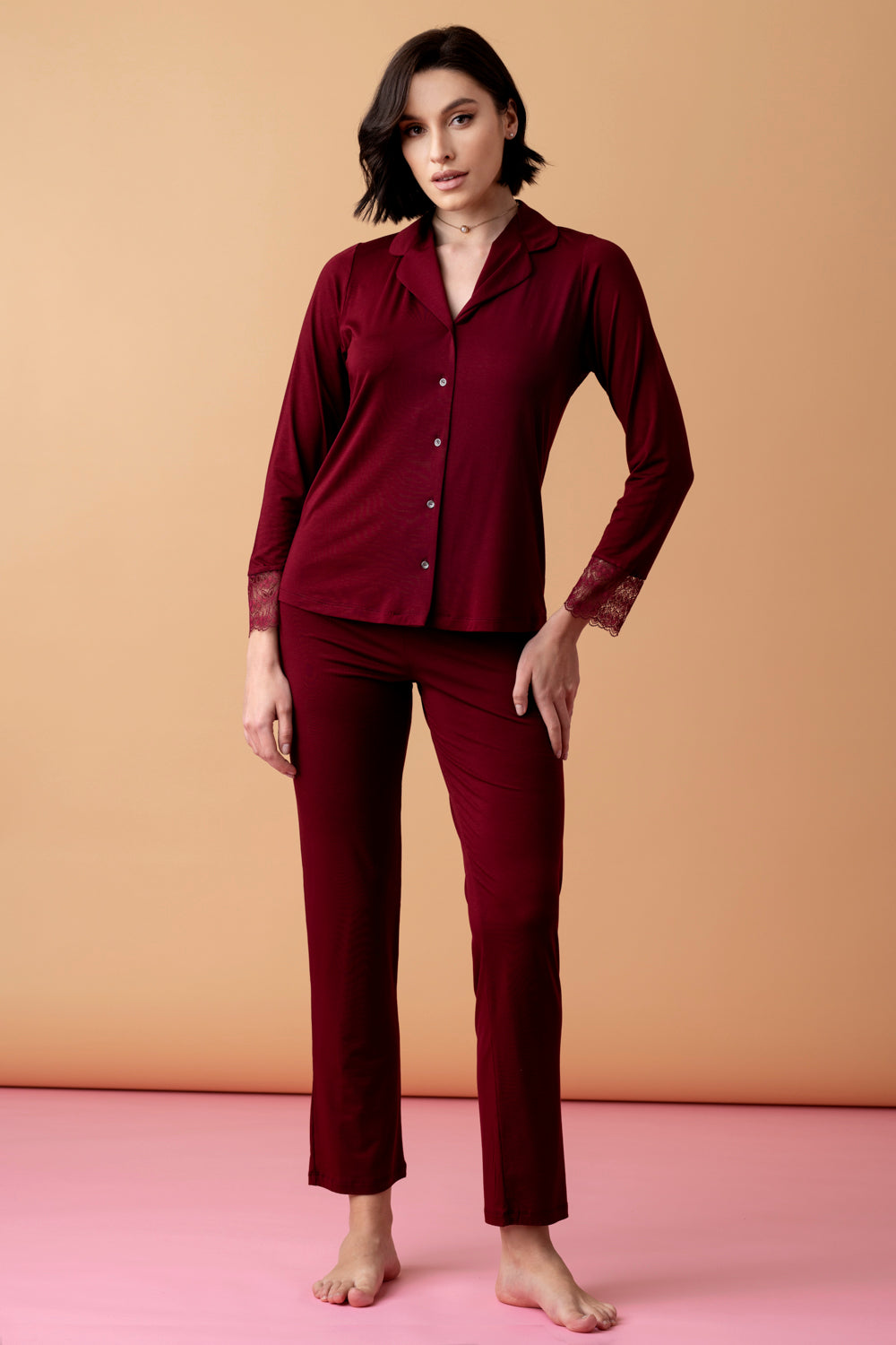 Poem – Long Button-Down Pajamas with Lace – Red Wine