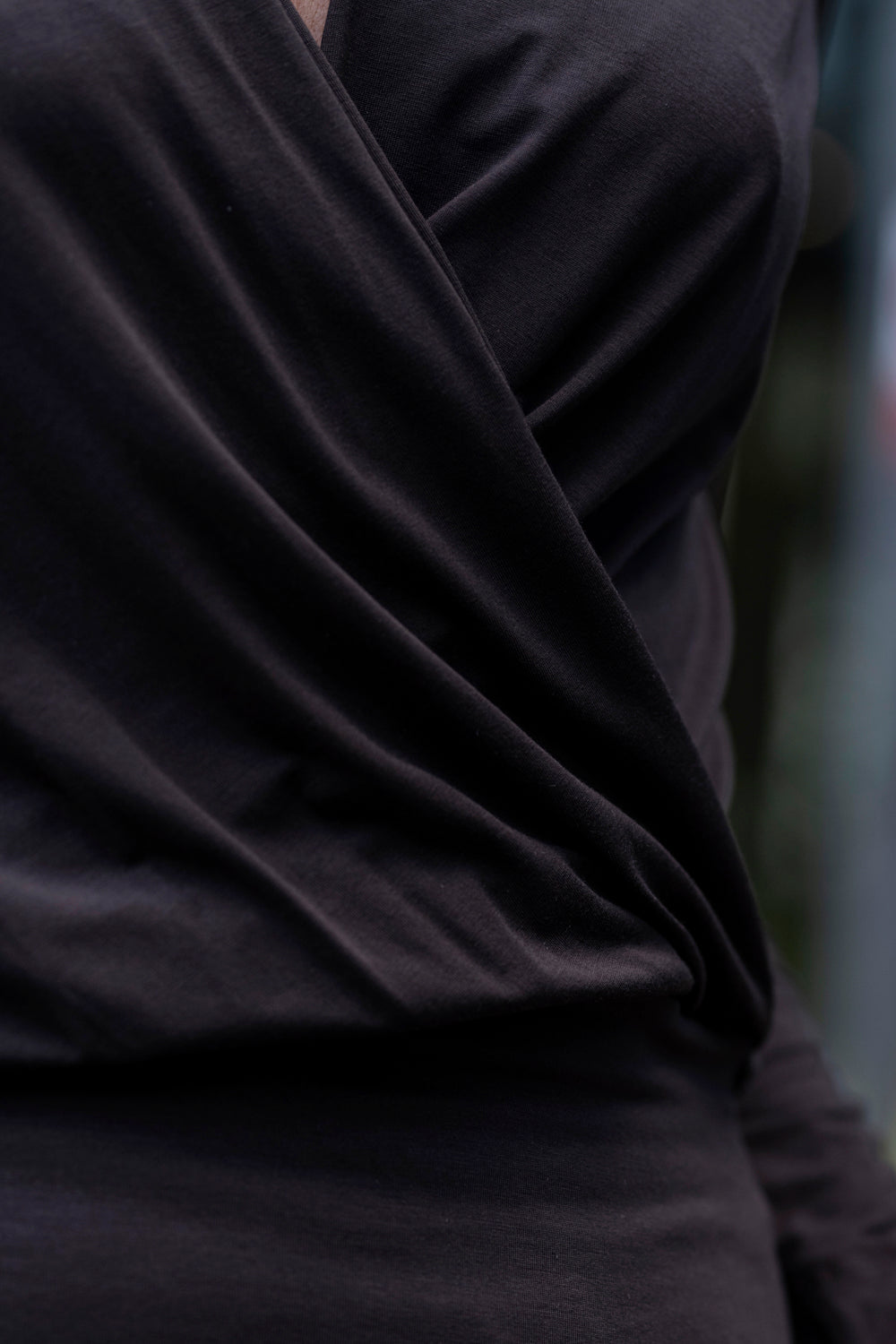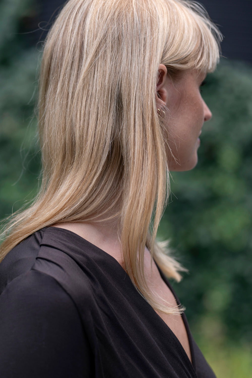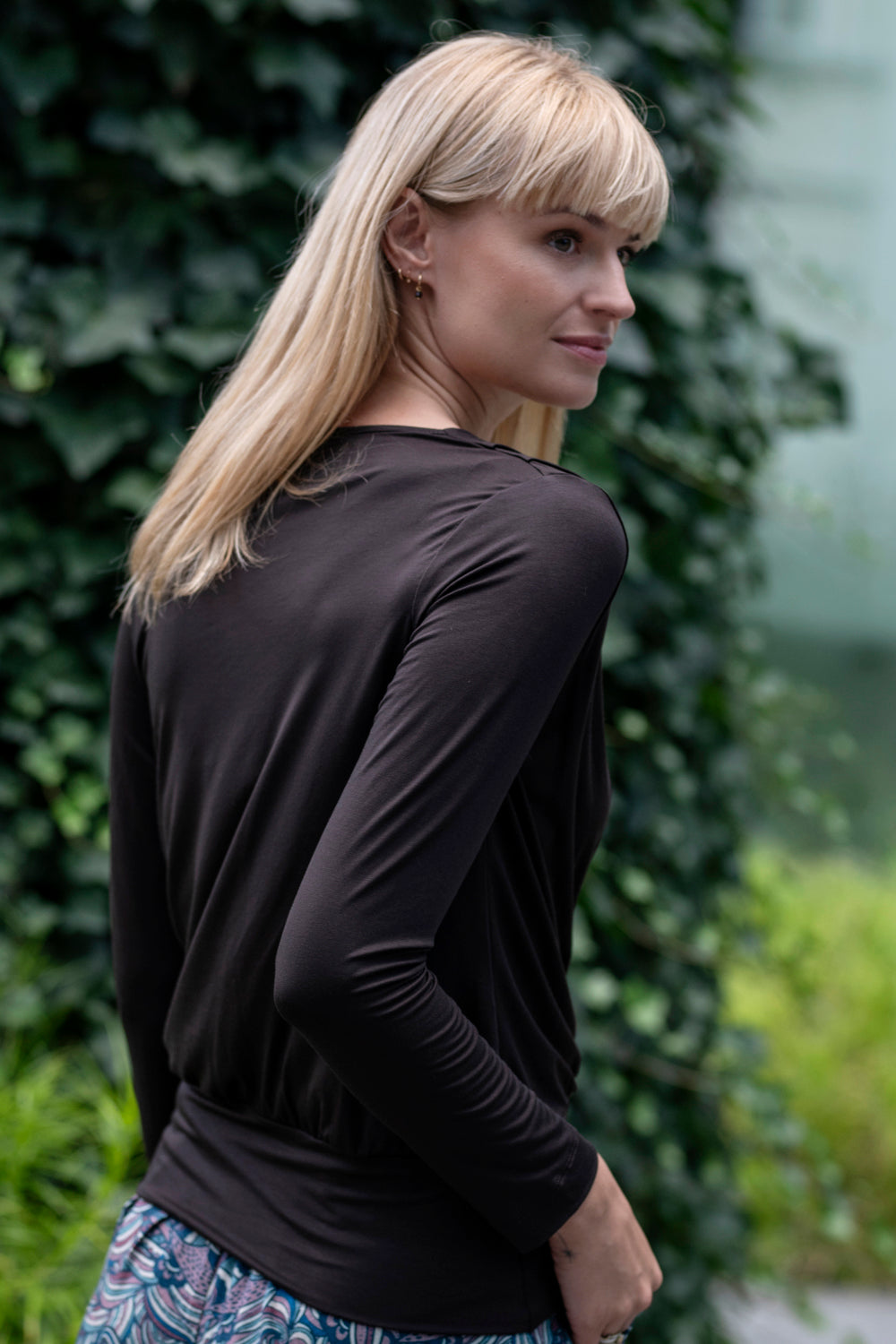 Soft, feminine, and full of subtlety – this blouse is the perfect blend of lightness and elegance. The flowing viscose knit delicately drapes the body, enveloping it like a mist. The wrap neckline beautifully accentuates the neck and collarbones. Pleats on the shoulders subtly shape the silhouette, and gathers at the hem give the blouse a relaxed, feminine shape.