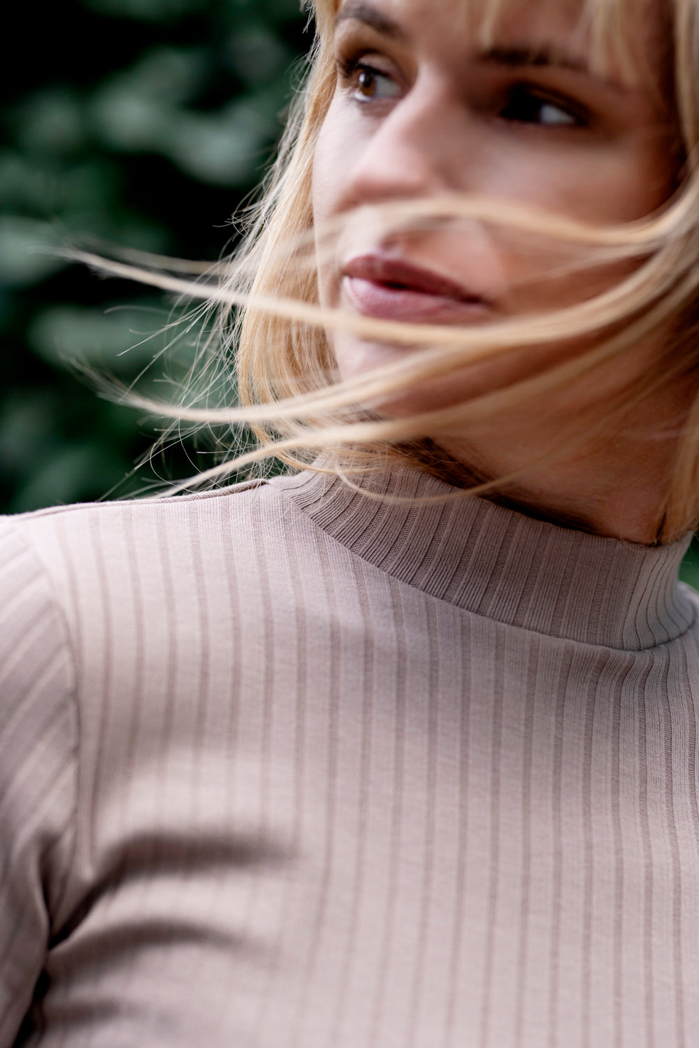 The calming shade of mocha and the softness of cotton create a hard-to-beat pairing. This turtleneck sweater in a chunky ribbed knit is the epitome of simplicity and harmony – subtle, yet full of character. It softly hugs the body, allowing you to focus on what truly matters – comfort and freedom of movement.