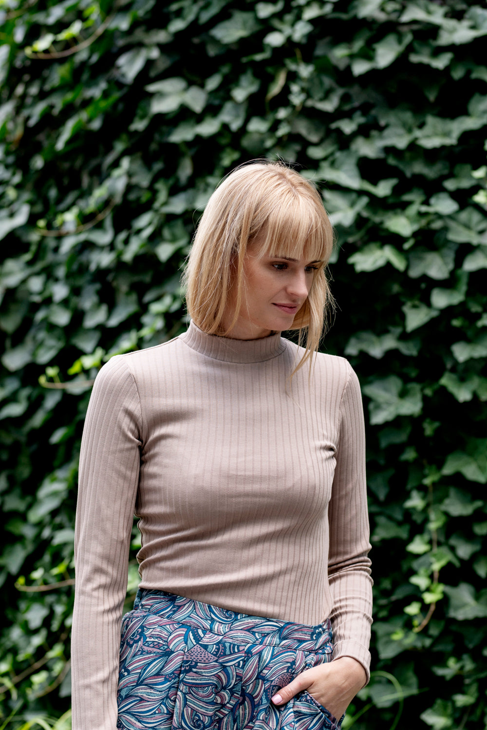 Its slightly fitted cut and classic turtleneck make it a staple in any capsule wardrobe . It pairs well with both elegant trousers and your favorite jeans. Its natural color palette brings calm and warmth—the perfect choice for days when less is more.
