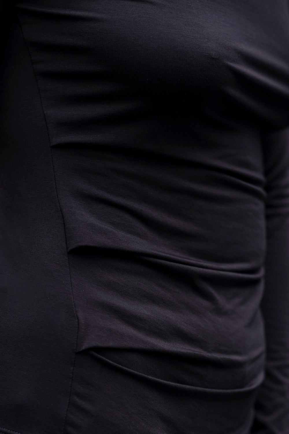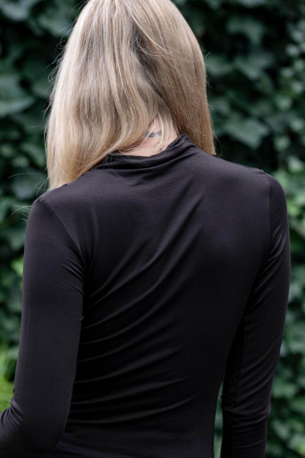 Subtle, feminine, and incredibly comfortable to wear, this turtleneck made of delicate viscose knit wraps the body in a softness reminiscent of a touch of mist. The cowl neckline drapes freely, adding a touch of lightness and elegance, while the pleats at the sides subtly shape the silhouette.