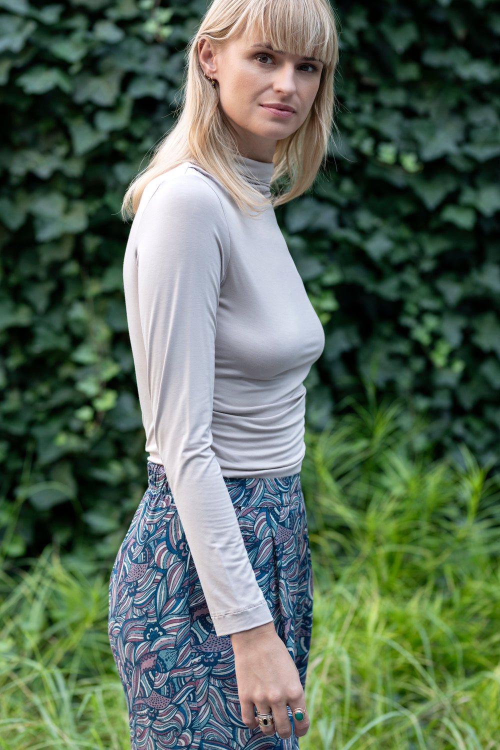 Delicate, feminine, and incredibly soft to the touch, this turtleneck made of a subtle viscose knit captivates with its simplicity and lightness, hugging the body like a second skin. The cowl neckline drapes softly, adding grace and ease to the overall look, while the pleats at the sides give the silhouette a natural shape.