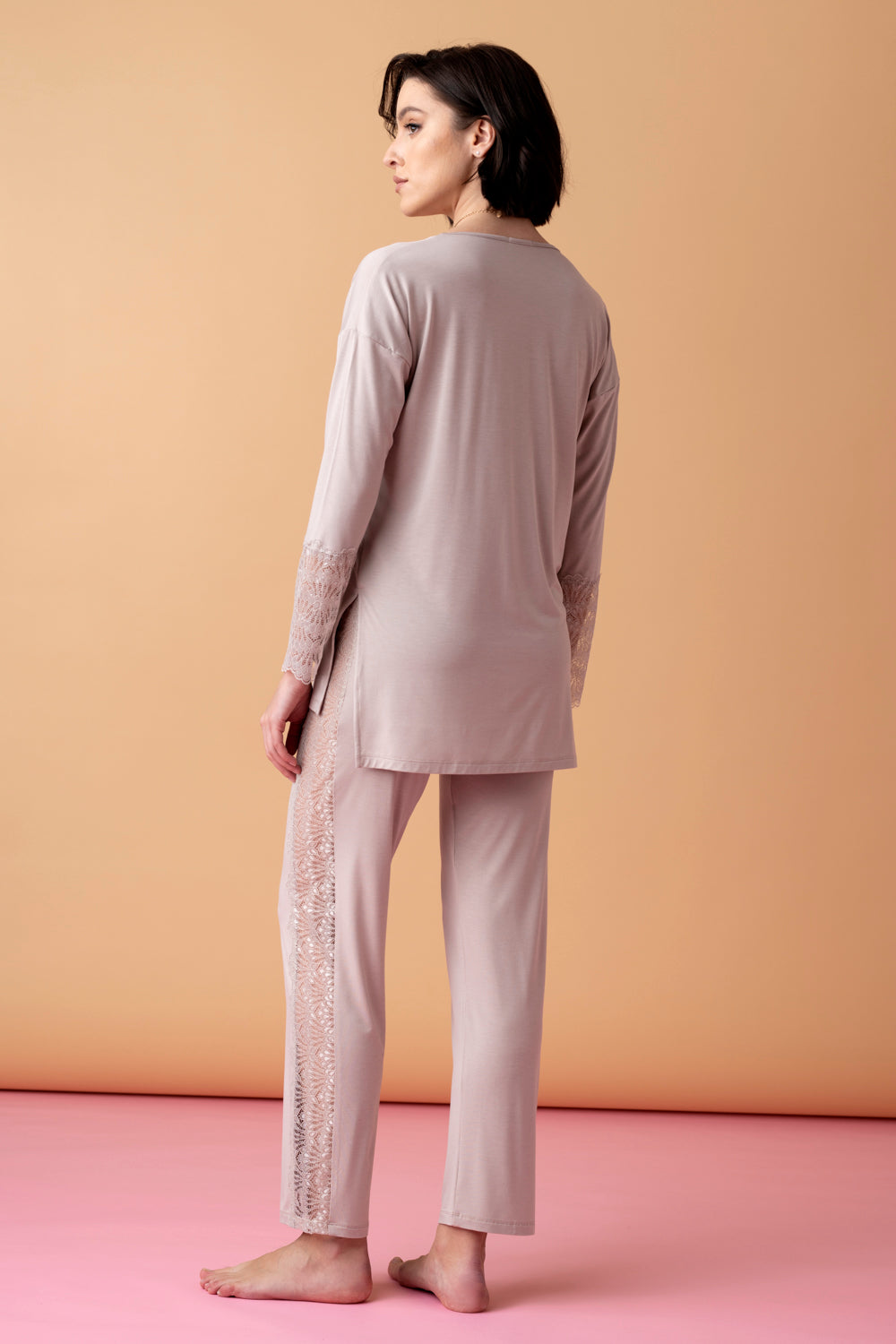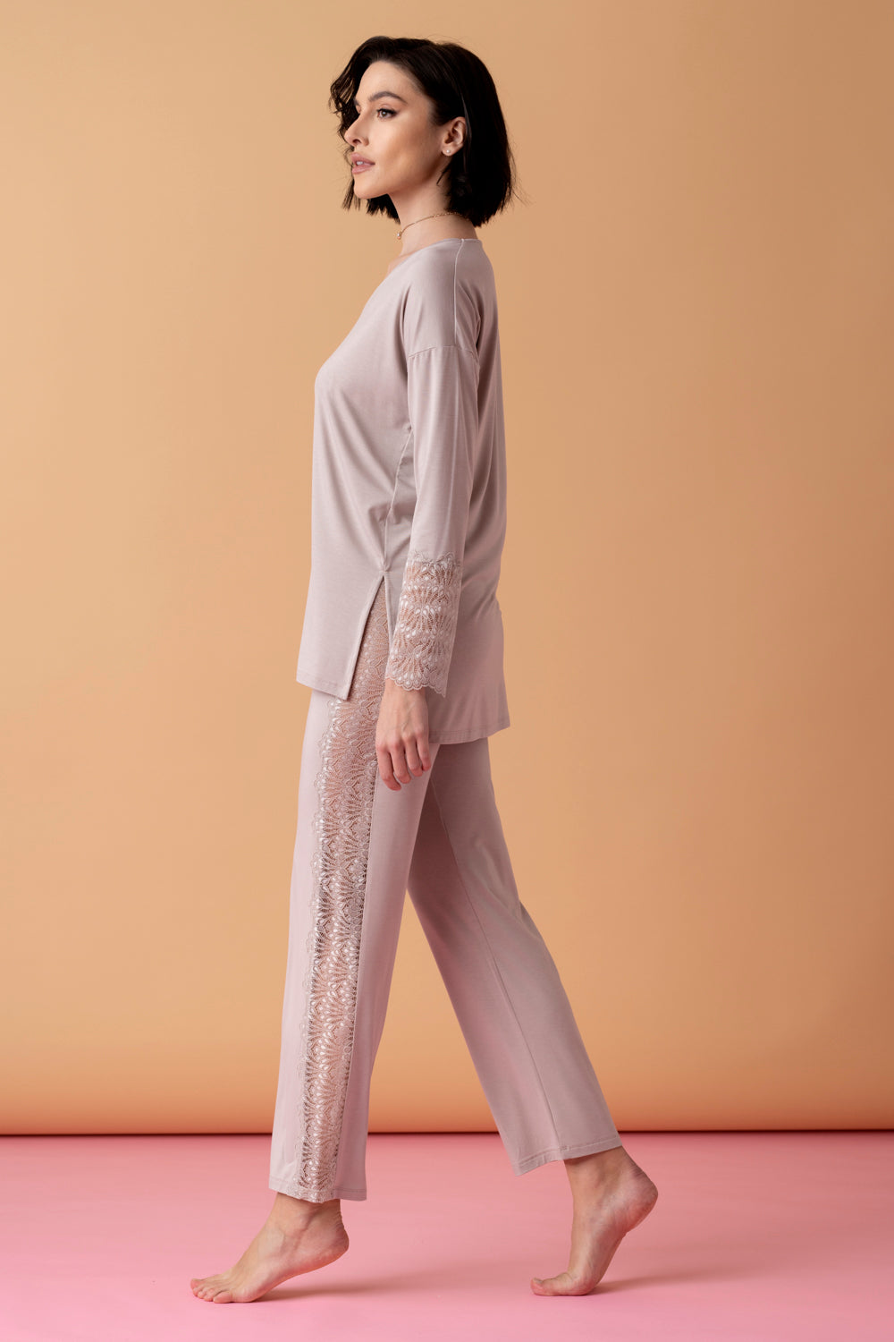 Luźna bluzka z dekoltem w serek i wydłużonym tyłem układa się lekko na sylwetce, a koronkowe mankiety dodają jej finezji. Spodnie z prostymi nogawkami ozdobiono koronkowymi lampasami, które tworzą subtelną grę światła i przezroczystości przy każdym ruchu. Miękka dzianina otula ciało, a elastyczna gumka w pasie zapewnia wygodę od wieczora aż po leniwy poranek.