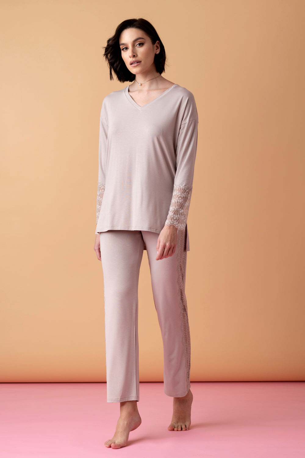 Poem – długa piżama z koronkowymi lampasami – mleko migdałowe