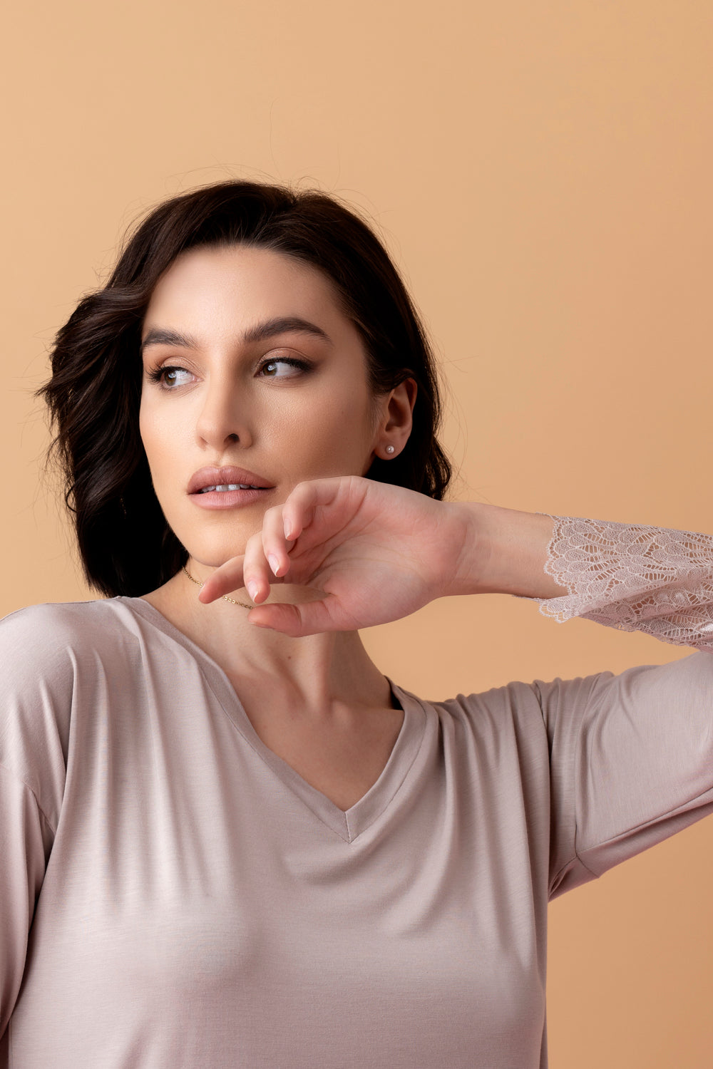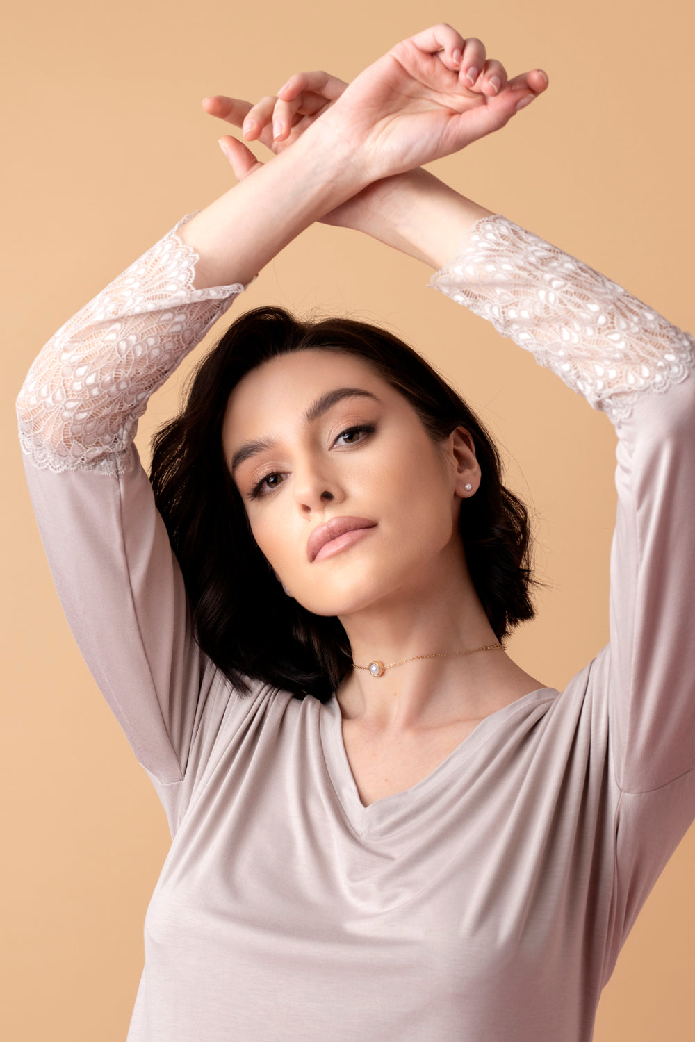 Delikatna jak poranna mgła i miękka niczym ulubiony koc – piżama w odcieniu mleka migdałowego to kwintesencja subtelności. Ten komplet z linii Poem został stworzony z myślą o wieczorach, które chcesz spędzać spokojnie, w pełnym komforcie, a jednak z poczuciem, że nosisz coś wyjątkowego.