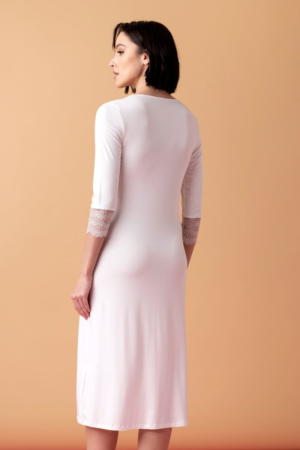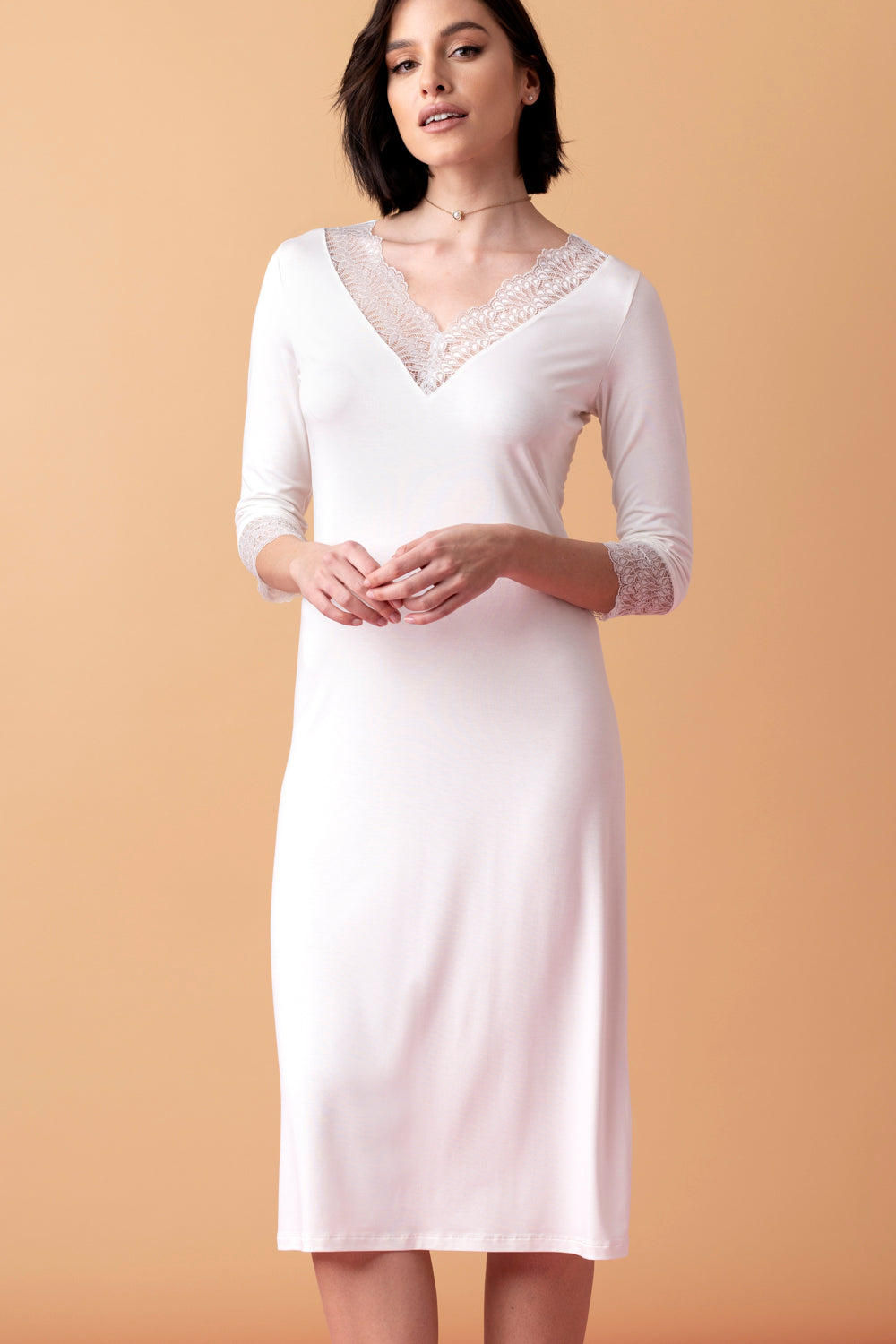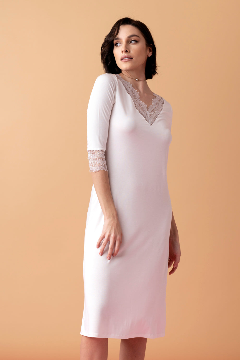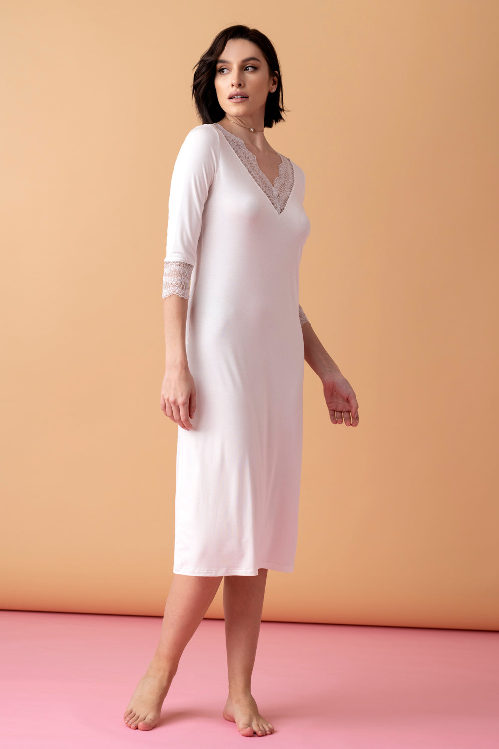 Dekolt w serek, ozdobiony półprzezroczystą koronką, wprowadza subtelny urok, a rękawy 3/4 zakończone koronkowym mankietem dodają całości delikatnej finezji. Długość za kolano sprawia, że sylwetka nabiera lekkości, a dopasowany fason podkreśla kobiece linie. To koszula nocna, w której łatwo zatracić się w marzeniach – czy to wieczorem przy książce, czy o poranku przy filiżance kawy.