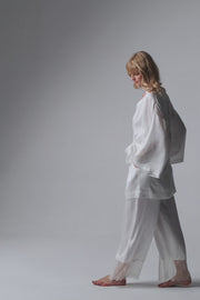Przód wykończony gładką plisą podkreśla czystość formy, a pasek w talii pozwala dopasować peniuar do sylwetki – nosić go swobodnie lub bardziej kobieco, z zaznaczoną talią. Dyskretne kieszenie dodają funkcjonalności, nie zaburzając eleganckiej całości.