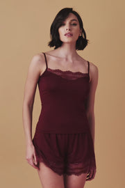 Czerwień tej piżamki przypomina szept nocy pełnej namiętności. To kolor, który od razu przyciąga uwagę – głęboki i zmysłowy, a jednocześnie elegancki. Góra na smukłych ramiączkach miękko układa się na ciele, a koronkowe wykończenie dekoltu sprawia, że każdy detal nabiera wyrazistości. Tył odsłania łopatki, pozostawiając miejsce dla subtelnej gry spojrzeń.