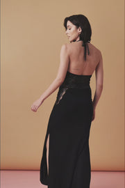Tył z transparentnej koronki odsłania łopatki i linię talii, a po bokach półprzezroczyste wstawki dodają całości lekkości. Rozporki po bokach delikatnie eksponują nogi, nadając sylwetce swobodę i wdzięk.