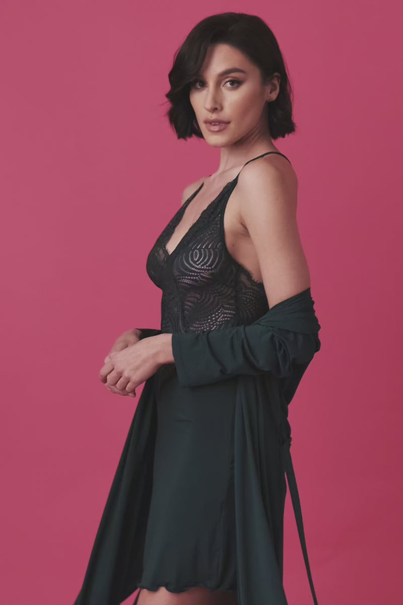 Wieczór w odcieniach głębokiej zieleni. Koszulka Serenade to subtelne połączenie miękkiej, elastycznej dzianiny i delikatnej koronki o wzorze liści paproci. Transparentna koronka otula dekolt i talię, tworząc zmysłowy kształt litery V, a na plecach delikatnie odsłania łopatki.