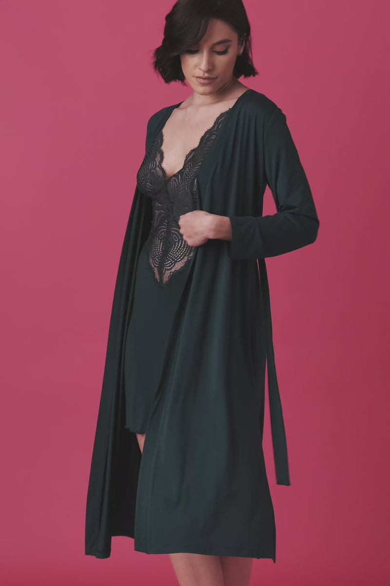 Otulający, elegancki i ponadczasowy — peniuar Stars w odcieniu głębokiej butelkowej zieleni to propozycja dla kobiet, które cenią subtelny luksus w codziennych chwilach. Miękka dzianina wiskozowa delikatnie układa się na ciele, zapewniając komfort i przyjemność dotyku.